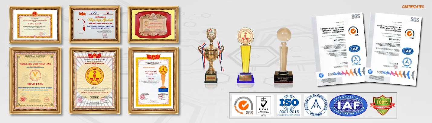 Công ty Cổ Phần Thiết Bị Vật Tư Ngân Hàng Và An Toàn Kho Quỹ Việt Nam đã được rất nhiều bằng khen, giấy chứng nhận, thương hiệu vàng do các ban ngành trao tặng từ năm 2003 đến nay được sơ lược như sau: